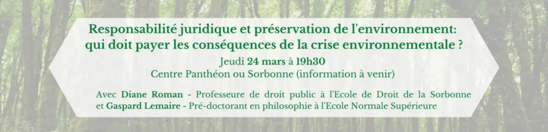 L'association des droits humains de la Sorbonne et Planète Sorbonne ont le plaisir de vous annoncer que jeudi 24 mars à 19h30 se déroulera une conférence sur le thème ''Responsabilité juridique et préservation de l'environnement : qui doit payer les conséquences de la crise environnementale?''.