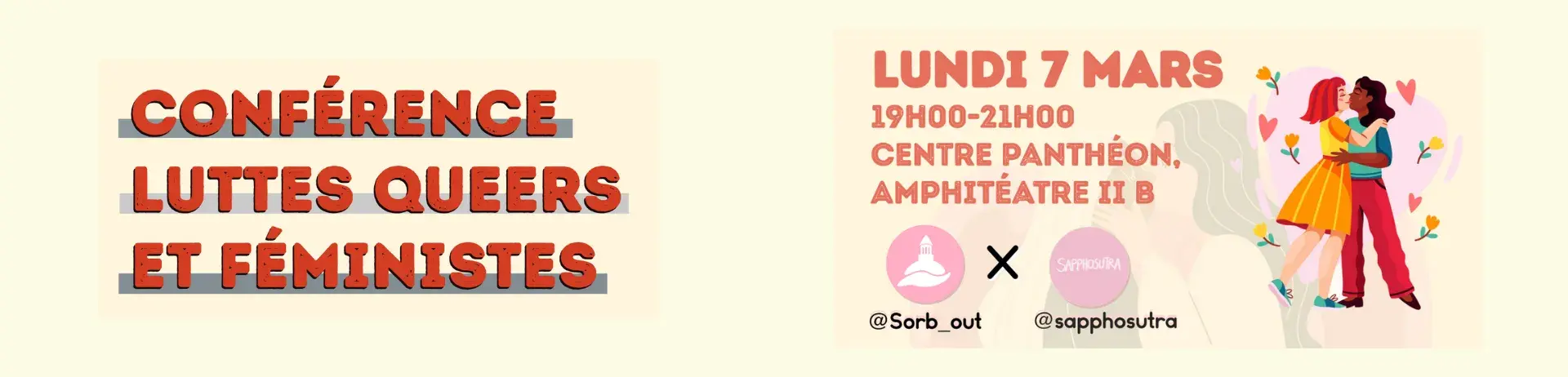 À l’occasion du 8 mars, journée internationale des droits des femmes, Sorb'Out, l’association LGBTQIA+ de Paris 1 Panthéon-Sorbonne, a le plaisir de recevoir Sapphosutra, duo d’artistes féministes, queers et militant·e·s lors d’une conférence qui se tiendra le lundi 7 mars 2022 à 19 h dans l'amphithéâtre II.B du centre Panthéon.